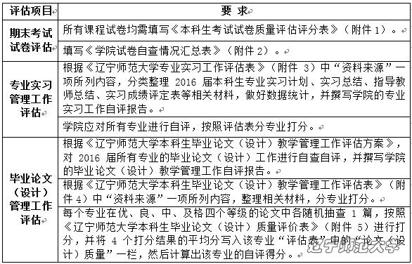 专业实习和毕业论文(设计)管理工作评估:《辽宁师范大学专业实习工作评估实施办法》《辽宁师范大学本科生毕业论文(设计)教学管理工作评估方案》。