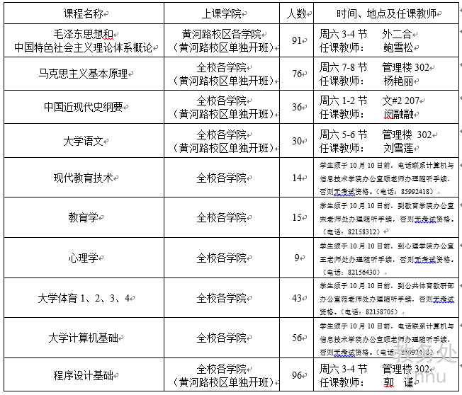 本学期重修课程从10月11日开始上课,具体安排如下: