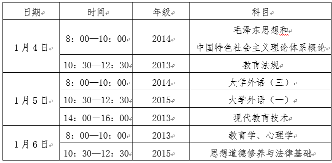 2012、2013、2014级授课时间截止到2015年12月25日,2015级授课时间截止到2015年12月31日。考查课考试在第19周前结束。
