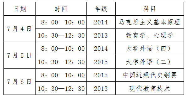 根据教学计划和校历安排,本学期2013级、2014级、2015级的授课时间截止到2016年6月24日,7月4日至14日为期末考试时间。具体安排如下: